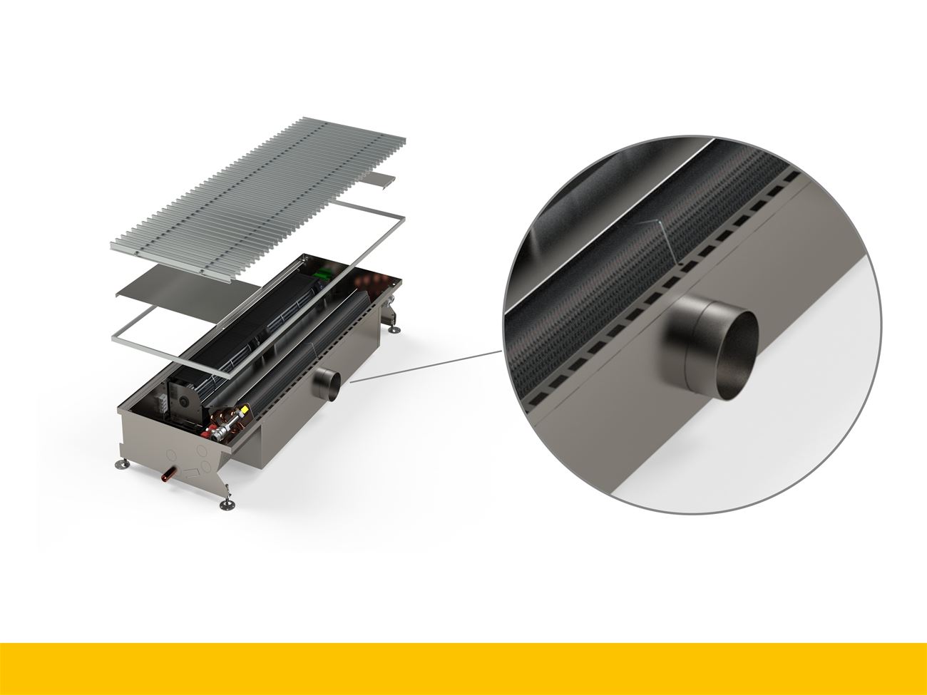 Pro optimální výkon větrání doporučujeme naše konvektory typu AIR, kde přiváděný vzduch prochází nárazníkem a výstup je elegantně umístěn pod mřížkou.Tím se nejen snižuje rychlost proudění vzduchu, ale i hladina hluku. Zároveň vám umožňujeme atypická řešení – například speciální nárazník umístěný zespodu konvektoru, který umožňuje výstup vzduchu na opačné straně.